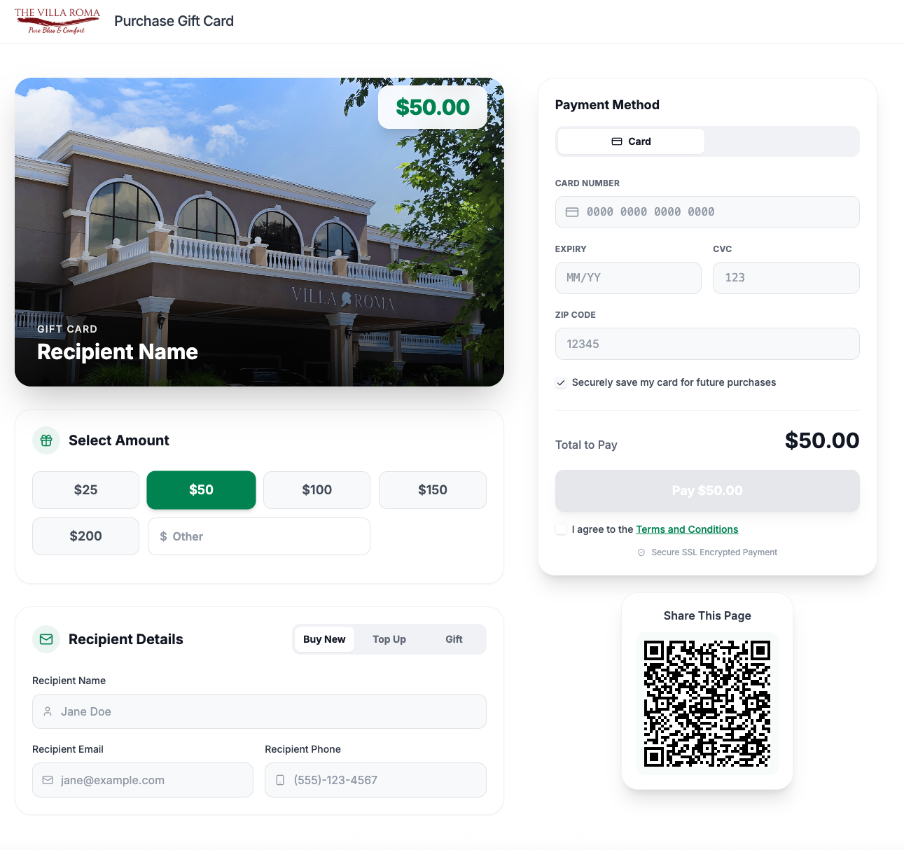 Every card, checkout page, and email carries your brand. Guests buy, reload, and gift cards through fully branded ecommerce pages — Vitabyte stays invisible.
